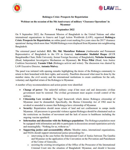 On 9 September 2022, the Permanent Mission of Bangladesh to the United Nations and other international organisations in Geneva and Legal Action Worldwide (LAW), organised Rohingya Crisis: Prospects for Repatriation, an online panel event marking five years since the 2017 ‘clearance operations’ during which more than 740,000 Rohingya were displaced from Myanmar into neighbouring Bangladesh.