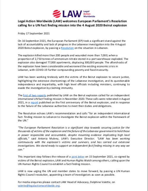 Press Release: LAW welcomes European Parliament’s Resolution calling for a UN Fact finding mission into the 4 August 2020 Beirut explosion