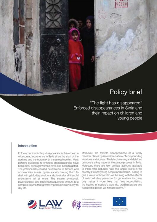 Moreover, the forcible disappearance of a family member places Syrian children at risk of compounding violations and abuses. The fate of missing and detained persons is a key issue for the peace process in Syria. Moreover, there are few political avenues available to those who arguably have the largest stake in the country’s future; young people and children. Failing to give a voice to those who will be living with the effects of enforced disappearance for generations to come only makes it more likely that “true reconciliation, the healing of society’s wounds, credible justice and sustainable peace will remain elusive.”
