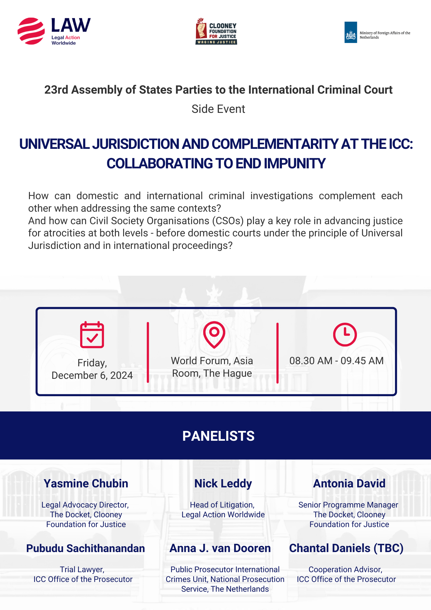 During the 23rd session of the Assembly of States Parties (ASP23) to the International Criminal Court (ICC), Legal Action Worldwide and the Clooney Foundation for Justice will host a side event exploring how civil society organizations (CSOs) and domestic prosecutors can contribute to international justice efforts in partnership with the ICC. This event will examine how national actors and CSOs are advancing universal jurisdiction (UJ) litigation while simultaneously supporting investigations by the ICC Office of the Prosecutor (OTP). The side event will be sponsored by the Kingdom of the Netherlands.