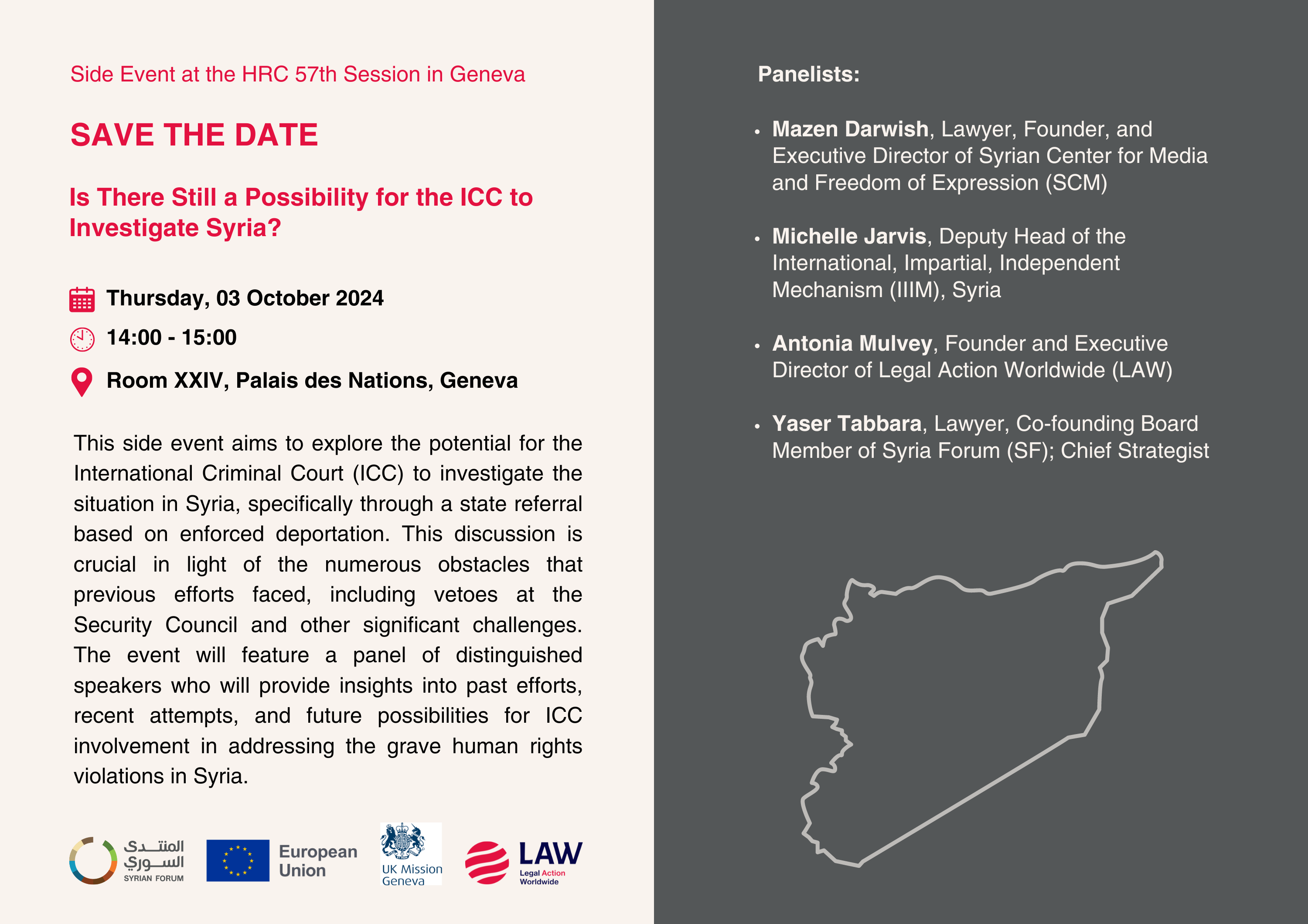 This side event aims to explore the potential for the International Criminal Court (ICC) to investigate the situation in Syria, specifically through a state referral based on enforced deportation. This discussion is crucial in light of the numerous obstacles that previous efforts faced, including vetoes at the Security Council and other significant challenges. The event will feature a panel of distinguished speakers who will provide insights into past efforts, recent attempts, and future possibilities for ICC involvement in addressing the grave human rights violations in Syria.