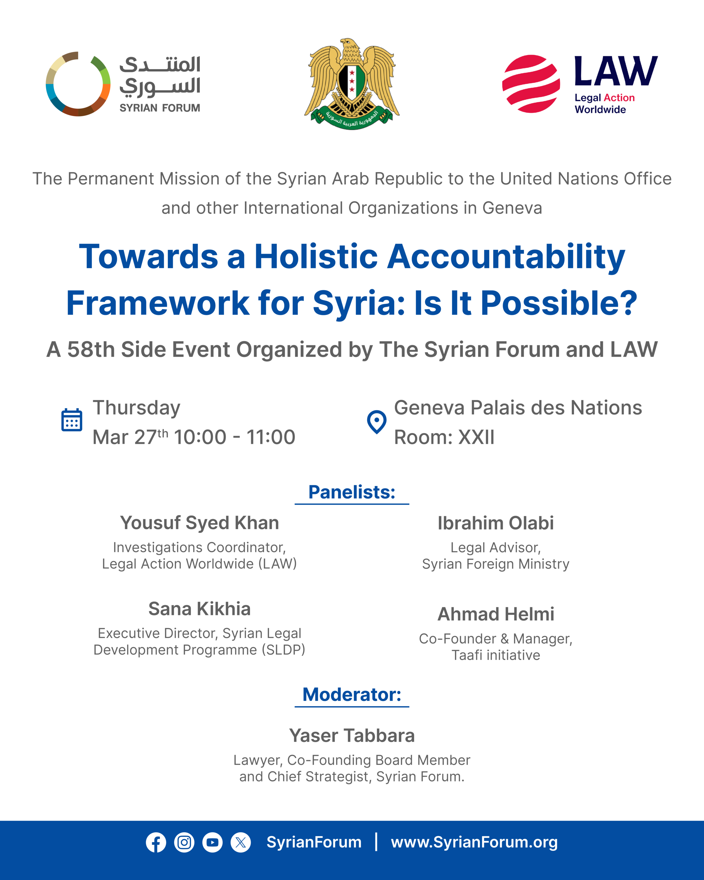With the new Syrian government expressing readiness to cooperate with international mechanisms, this event will explore the feasibility of consolidating these mechanisms into a structured framework. Can Syria adopt a cohesive justice process that combines national and international accountability efforts?