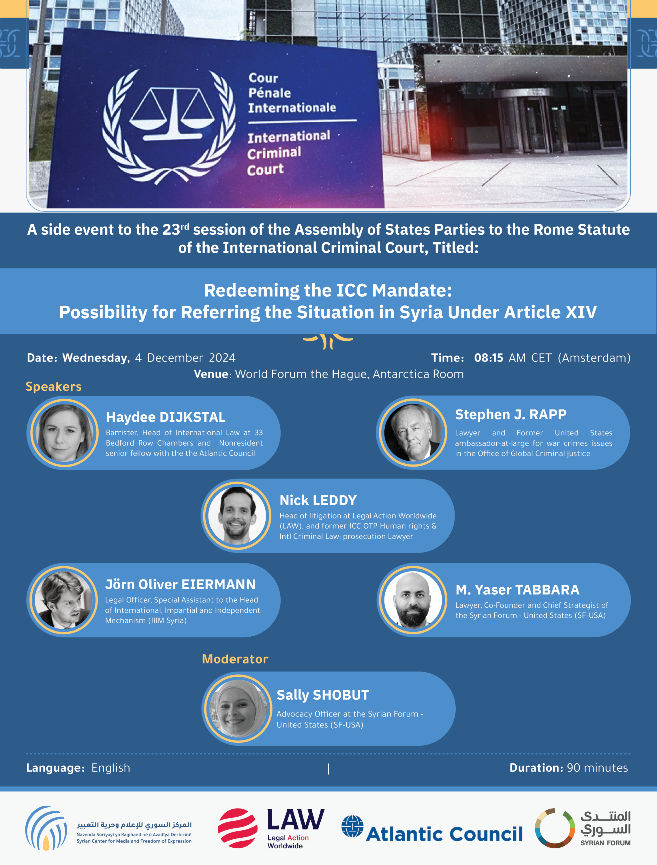This event will explore the critical role the International Criminal Court (ICC) could play in addressing the Syrian crisis. The panel will analyse the institutional risks and credibility challenges the Court faces if it fails to intervene meaningfully. Discussions will focus on how a State Party-led referral under Article 14 can bolster the ICC’s legitimacy and create a pathway for accountability in Syria. The panel will also emphasise the importance of civil society and State Party sponsorship to maximise the impact of accountability efforts.