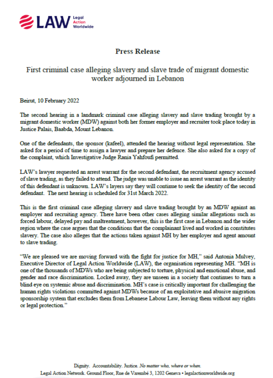 LAW’s lawyer requested an arrest warrant for the second defendant, a recruitment agency, the recruiter accused of slave trading, as they failed to attend. The judge was unable to issue an arrest warrant as the identity of this defendant is unknown. LAW’s lawyers say they will continue to seek the identity of the second defendant. The next hearing is scheduled for 31st March 2022.