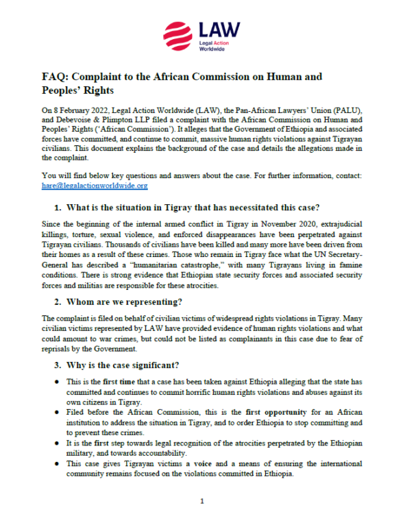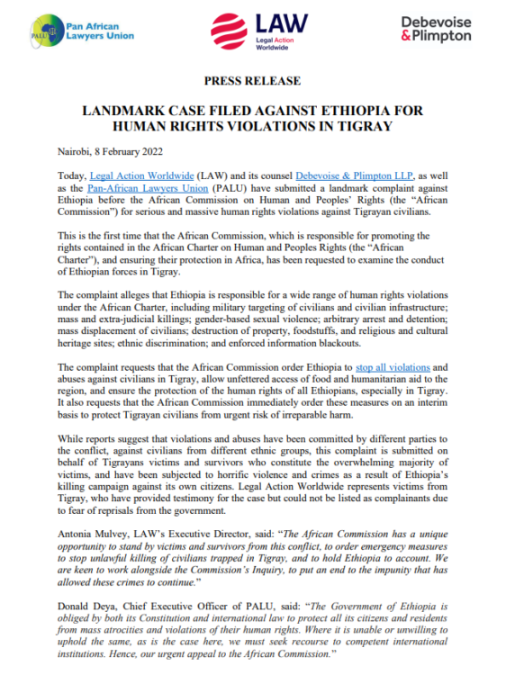 Today, Legal Action Worldwide (LAW) and its counsel Debevoise & Plimpton LLP, as well as the Pan-African Lawyers Union (PALU) have submitted a landmark complaint against Ethiopia before the African Commission on Human and Peoples’ Rights (the “African Commission”) for serious and massive human rights violations against Tigrayan civilians.