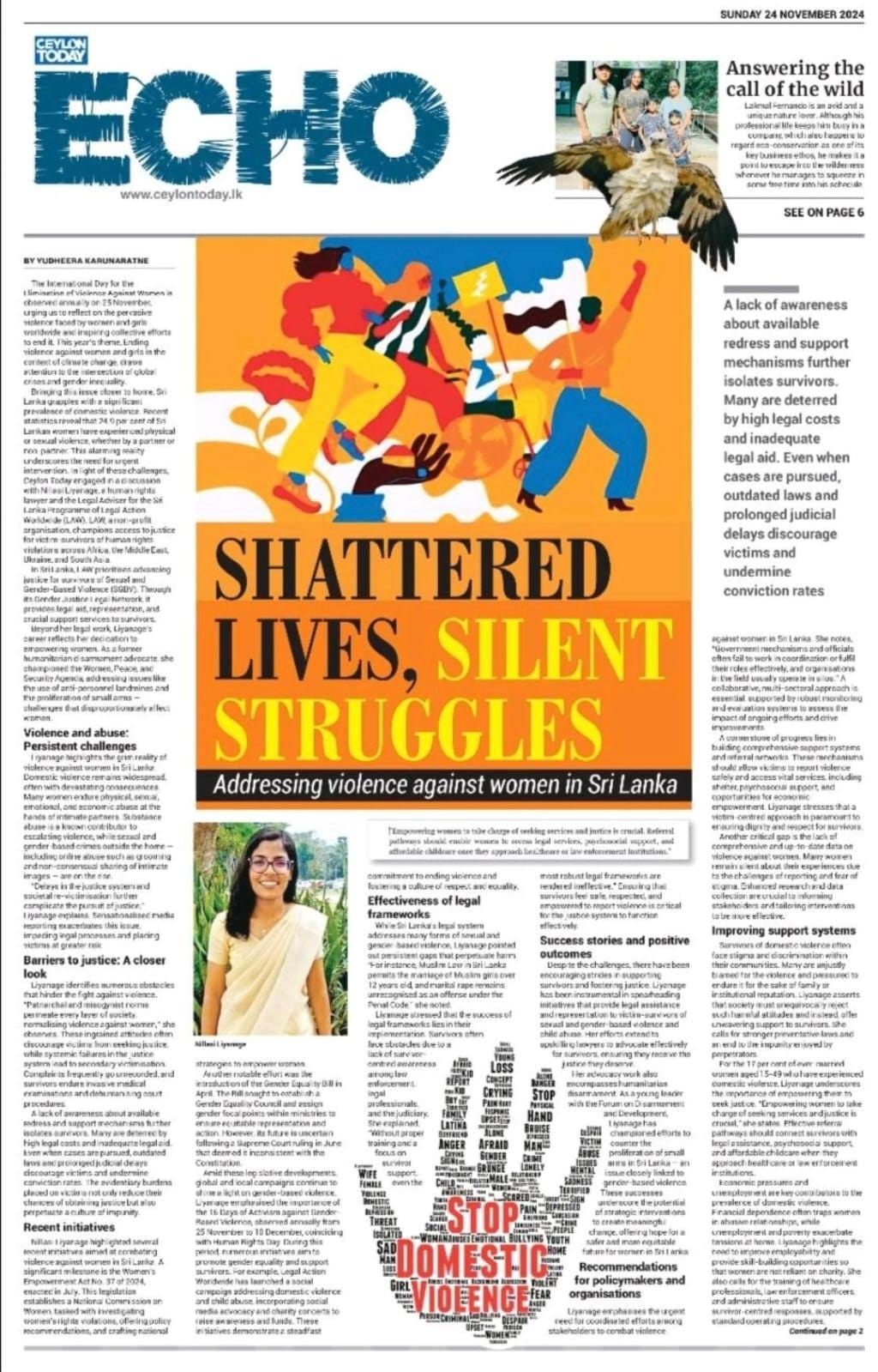 In light of the International Day for the Elimination of Violence Against Women, Ceylon Today engaged in a discussion with Nillasi Liyanage, a human rights lawyer and Legal Adviser for the Sri Lanka Programme at LAW.